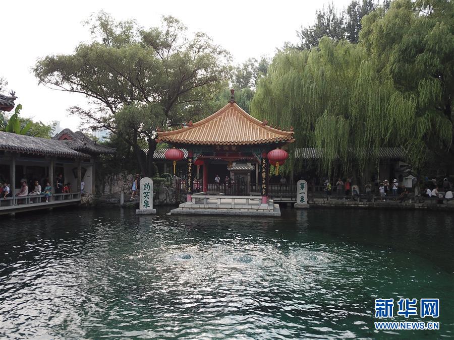 8月28日,游客在观赏济南趵突泉“水涌若轮”景观(无人机拍摄)。 新华社发(吕传泉 摄)