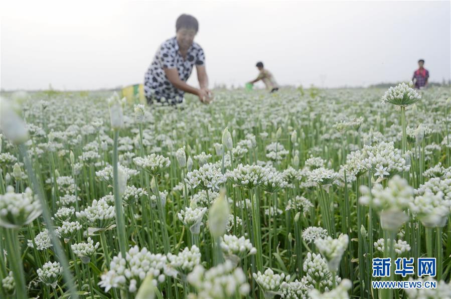 8月28日,在滨城区三河湖镇大营刘村乐旋自然蔬菜专业合作社韭菜基地,村民们在采摘韭花。近日,山东省滨州市滨城区三河湖镇韭菜基地万亩韭花飘香,进入采摘季节。目前,该镇韭菜种植面积已达1万余亩,成为助推农民增收、振兴乡村的支柱产业。新华社发 李荣新 摄