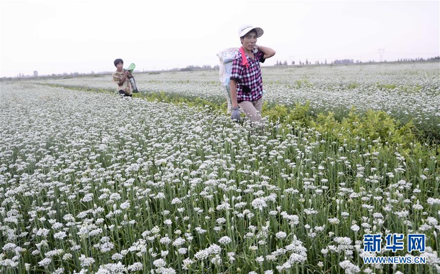 8月28日,在滨城区三河湖镇大营刘村乐旋自然蔬菜专业合作社韭菜基地,村民尹美英(右)等人将采摘的韭花运出基地。近日,山东省滨州市滨城区三河湖镇韭菜基地万亩韭花飘香,进入采摘季节。目前,该镇韭菜种植面积已达1万余亩,成为助推农民增收、振兴乡村的支柱产业。新华社发 李荣新 摄