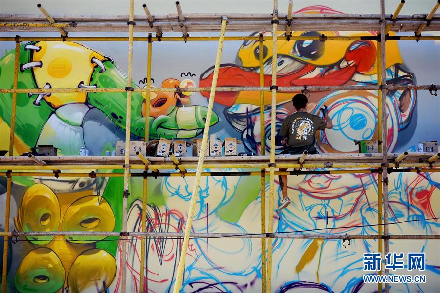 创作者在陕西洛南县玫瑰小镇进行涂鸦创作(8月28日摄)。8月28日,“中国·商洛(洛南)第二届国际涂鸦大赛”启动,来自国内外的44名涂鸦创作者齐聚洛南县玫瑰小镇,在村民的住房墙壁上绘制涂鸦作品,以涂鸦艺术带动当地旅游发展。新华社记者 刘潇 摄