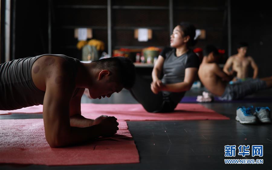 8月23日,在贵州省丹寨县万达小镇剧院,廖华山(左)和刘天红在排练前做身体力量训练。每天晚上,在贵州省黔东南苗族侗族自治州丹寨县万达小镇剧院上演的歌舞剧《锦秀丹寨》上,夫妻搭档廖华山和刘天红都会给观众带来近3分钟的彩带杂技表演。出生于1990年的廖华山和刘天红来自河南省,两人都从12岁开始学习杂技,从小随着不同的演出团队走南闯北。2011年他们因练习彩带杂技结缘,相知相爱成为了夫妻搭档。彩带杂技表演带有一定危险性,为了减少失误,夫妻俩每天都要做大量技巧、力量练习;搽药酒、贴药膏成了家常便饭,但他们都因为热爱这项传统表演而坚持着。 廖华山和刘天红现在最大心愿就是在每天的演出中尽情展示彩带杂技的梦幻之美,向观众呈现中国传统杂技的魅力。新华社发(黄晓海 摄)