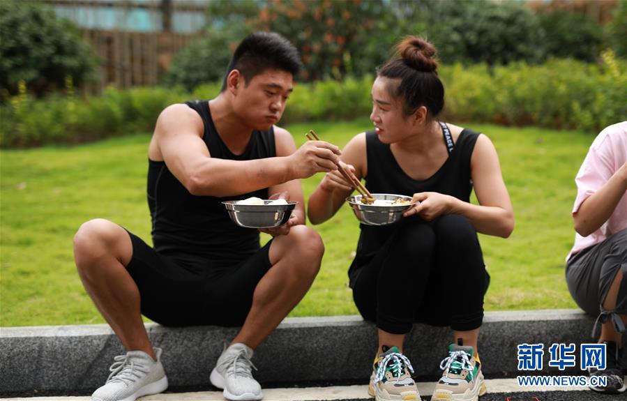 8月28日,在贵州省丹寨县万达小镇剧院,廖华山(左)给妻子刘天红夹菜。每天晚上,在贵州省黔东南苗族侗族自治州丹寨县万达小镇剧院上演的歌舞剧《锦秀丹寨》上,夫妻搭档廖华山和刘天红都会给观众带来近3分钟的彩带杂技表演。 出生于1990年的廖华山和刘天红来自河南省,两人都从12岁开始学习杂技,从小随着不同的演出团队走南闯北。2011年他们因练习彩带杂技结缘,相知相爱成为了夫妻搭档。彩带杂技表演带有一定危险性,为了减少失误,夫妻俩每天都要做大量技巧、力量练习;搽药酒、贴药膏成了家常便饭,但他们都因为热爱这项传统表演而坚持着。 廖华山和刘天红现在最大心愿就是在每天的演出中尽情展示彩带杂技的梦幻之美,向观众呈现中国传统杂技的魅力。新华社发(黄晓海 摄)