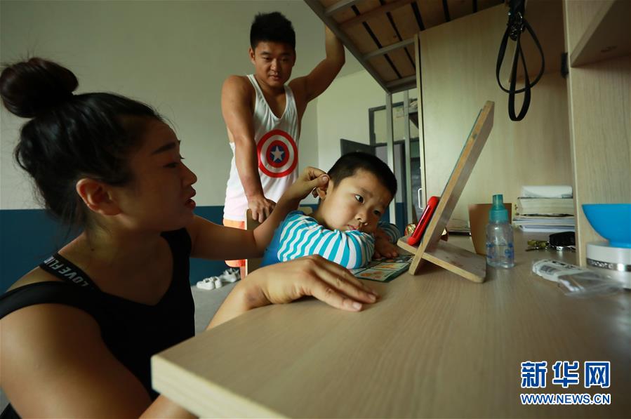 8月28日,在贵州省丹寨县城关一小演员宿舍,廖华山(中)和刘天红(左)动员5岁的儿子进幼儿园入学。每天晚上,在贵州省黔东南苗族侗族自治州丹寨县万达小镇剧院上演的歌舞剧《锦秀丹寨》上,夫妻搭档廖华山和刘天红都会给观众带来近3分钟的彩带杂技表演。 出生于1990年的廖华山和刘天红来自河南省,两人都从12岁开始学习杂技,从小随着不同的演出团队走南闯北。2011年他们因练习彩带杂技结缘,相知相爱成为了夫妻搭档。彩带杂技表演带有一定危险性,为了减少失误,夫妻俩每天都要做大量技巧、力量练习;搽药酒、贴药膏成了家常便饭,但他们都因为热爱这项传统表演而坚持着。 廖华山和刘天红现在最大心愿就是在每天的演出中尽情展示彩带杂技的梦幻之美,向观众呈现中国传统杂技的魅力。新华社发(黄晓海 摄)