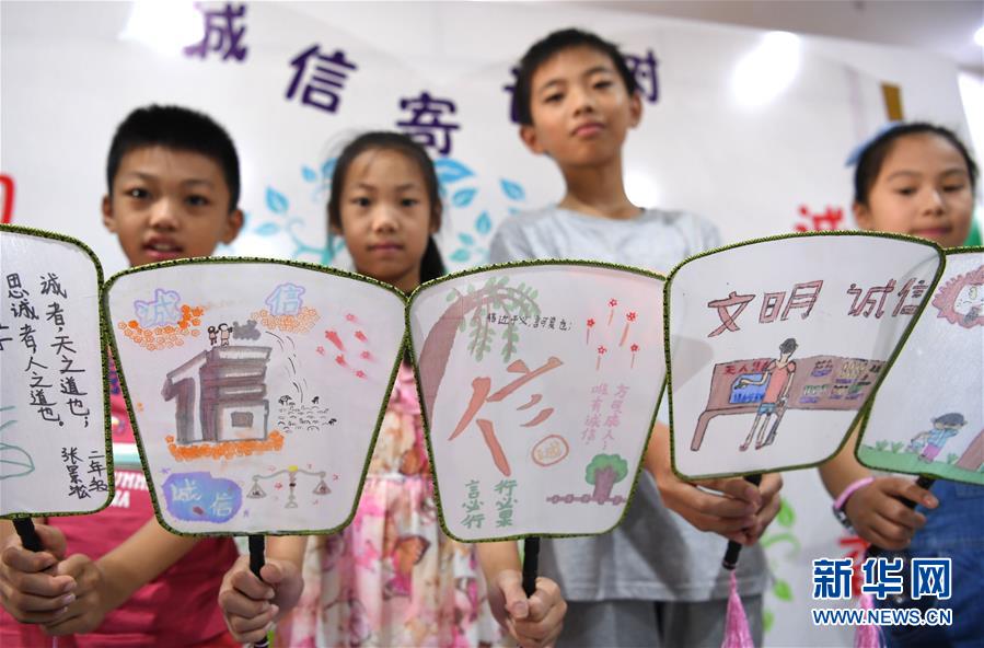 8月29日,几名小朋友在“诚信书香驿站”启用活动上展示绘制的诚信主题扇子。当日,安徽合肥市包河区常青街道“诚信书香驿站”在竹西社区半亩方塘城市阅读空间启用。社区居民可根据个人信用领取诚信借阅卡,不需付押金就可以免费借阅图书,倡导诚信风尚,培养全民阅读习惯。新华社记者 刘军喜 摄