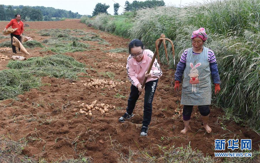8月28日,李骅旻艳在会泽县火红乡桥边村的庄稼地里体验劳作。暑假期间,云南省曲靖市麒麟区第七中学的李骅旻艳在父亲李小兵的陪同下来到几百里外的乌蒙山贫困地区,用自己积攒多年的压岁钱,给会泽县火红乡桥边村8户贫困家庭的孩子购买了学习用具,辅导小朋友做功课,与他们一起到山里放牛、干农活,度过一个有意义的假期。新华社记者 杨宗友 摄