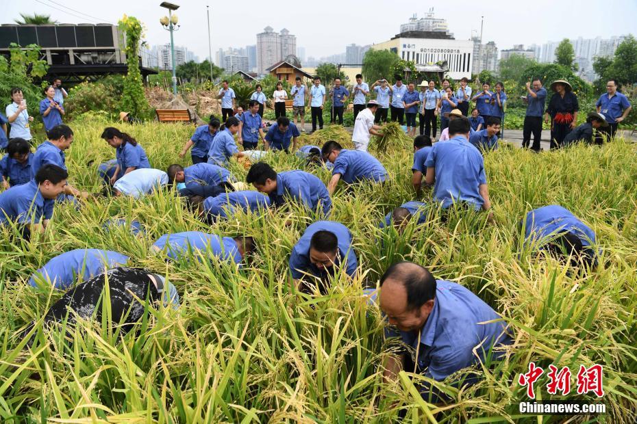 8月29日,重庆一工厂举行楼顶“开心农场”稻谷田里捉鱼比赛,为员工释放工作压力。图为参赛员工们正在稻谷田里捉鱼。中新社记者 陈超 摄