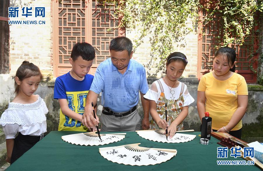 8月29日,在浙江省湖州市吴兴区道场乡施家桥村乡村振兴讲习所,书法老师在家风家训课上教青少年写扇面。新华社记者翁忻旸摄