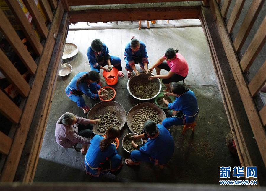8月29日,在广西龙胜各族自治县马堤乡张家塘苗寨,苗族群众在制作传统酒曲。 新华社发(黄勇丹 摄)