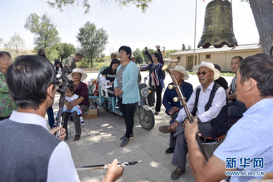新疆木垒哈萨克自治县英格堡乡月亮地村村民在村广场听地方戏——新疆曲子戏(8月26日摄)。 新华社记者赵戈摄
