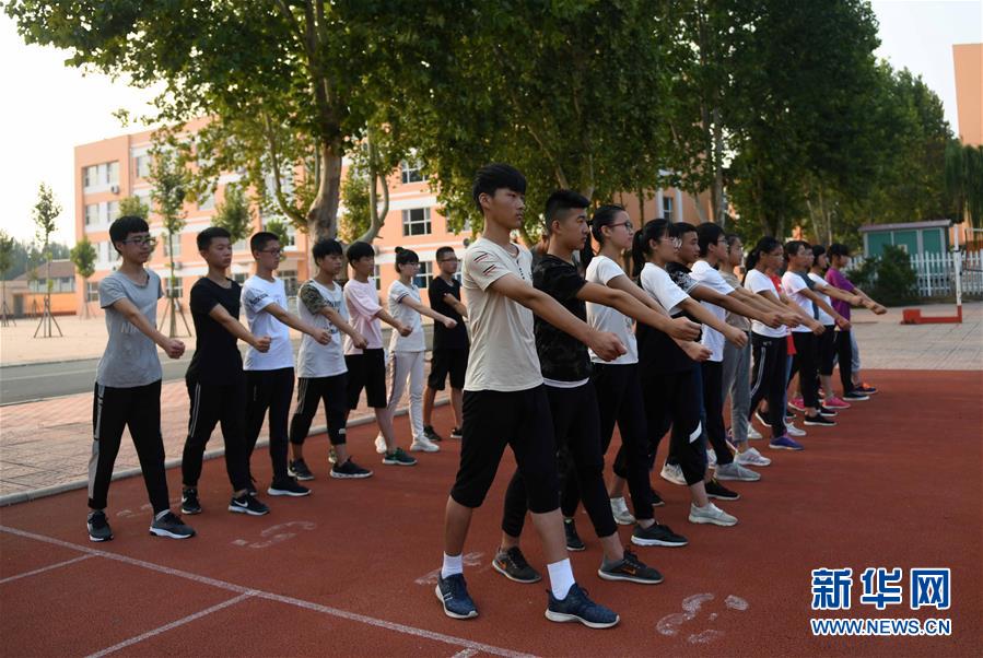 8月29日,寿光市上口镇广陵学校学生在参加军训。该校学区内共有9个村庄被淹,143名学生家中受灾。 记者从山东省政府29日16时召开的新闻发布会上获悉,截至8月29日11时,山东省有526.48万人遭受洪涝灾害,目前正全力开展保障灾区群众生活、依法有序开展受灾理赔、加快灾后生产自救等工作。 新华社记者朱峥摄