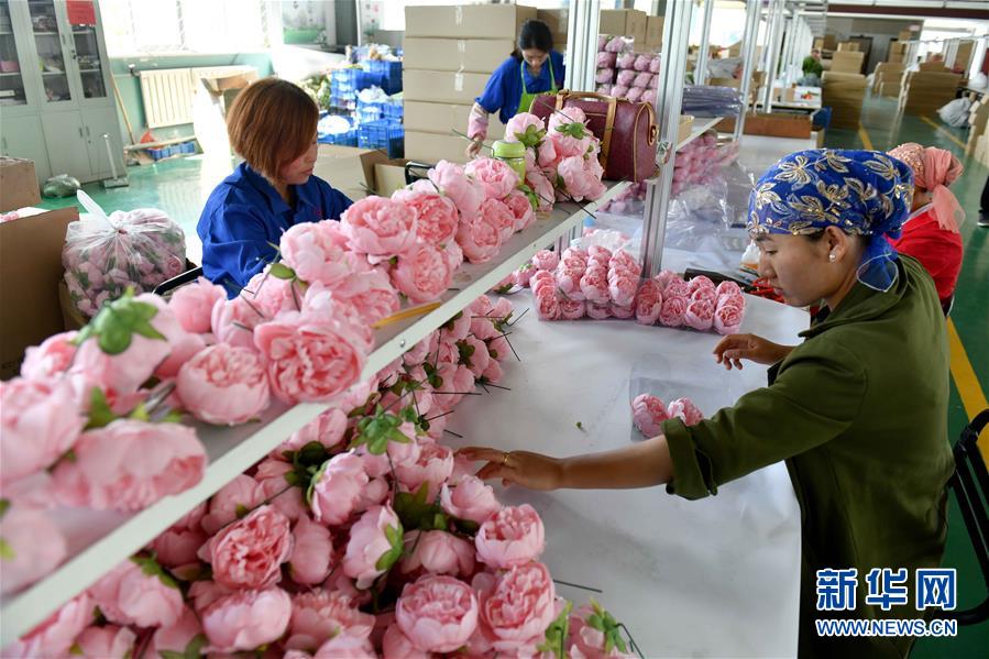 8月29日,工人在宁夏隆德人造花工艺有限公司制作人造花。 新华社记者王鹏 摄