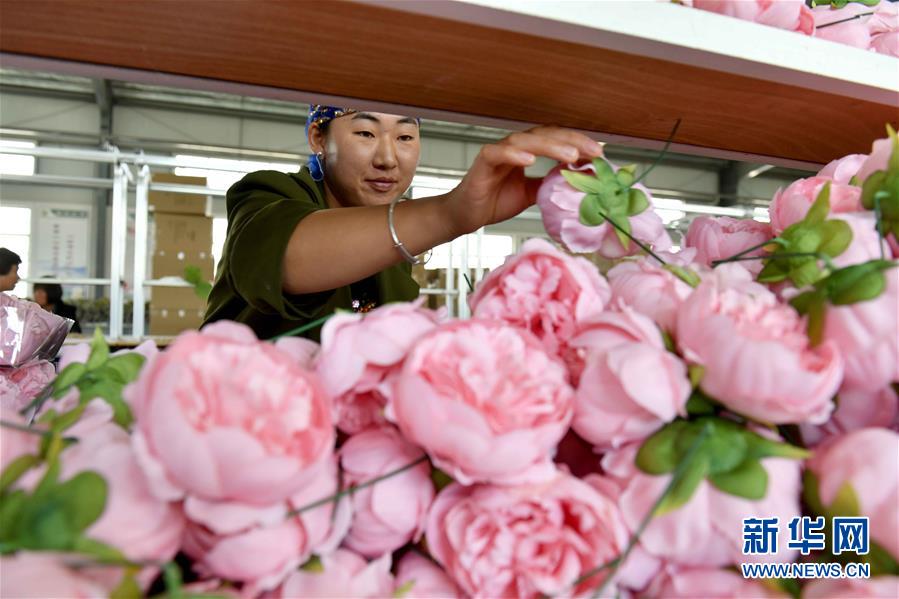8月29日,工人在宁夏隆德人造花工艺有限公司制作人造花。新华社记者郭绪雷 摄
