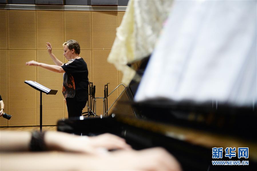 玛丽娜在哈尔滨大剧院为合唱团成员指导(8月18日摄)。新华社记者王凯 摄