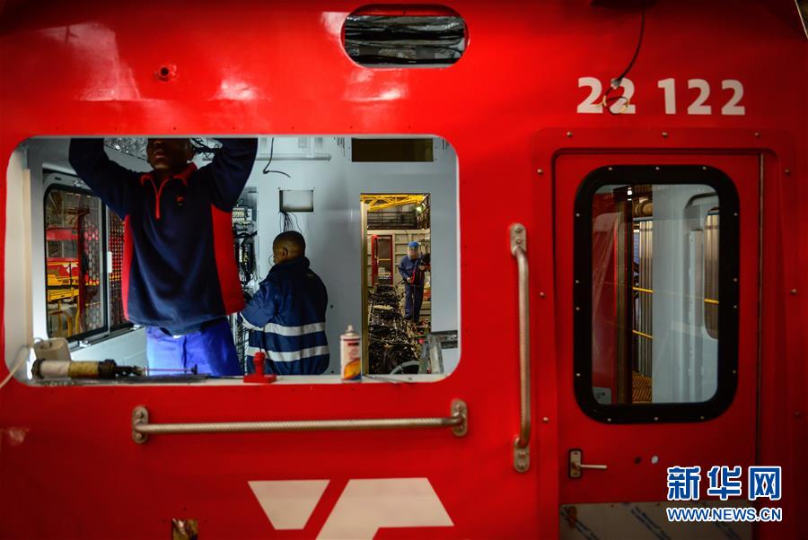 这是2017年7月27日,在南非比勒陀利亚南非运输集团工厂组装车间, 中南两国技术人员对一台待组装的中国机车司机室进行内部装饰。 新华社记者翟健岚摄