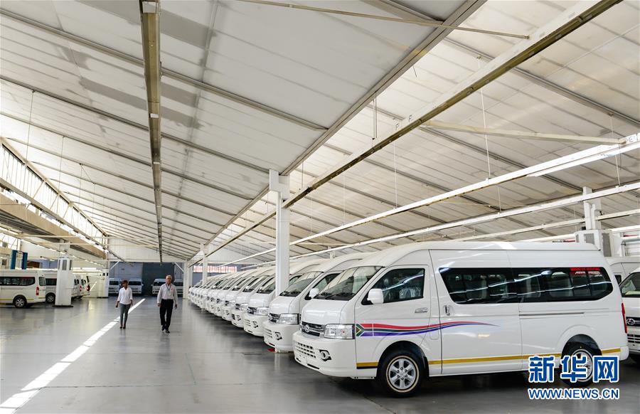 这是2016年4月19日,在北汽-中非汽车公司位于南非豪登省斯普林斯市工厂,两名工作人员从停放的小型巴士前走过。 新华社记者翟健岚摄