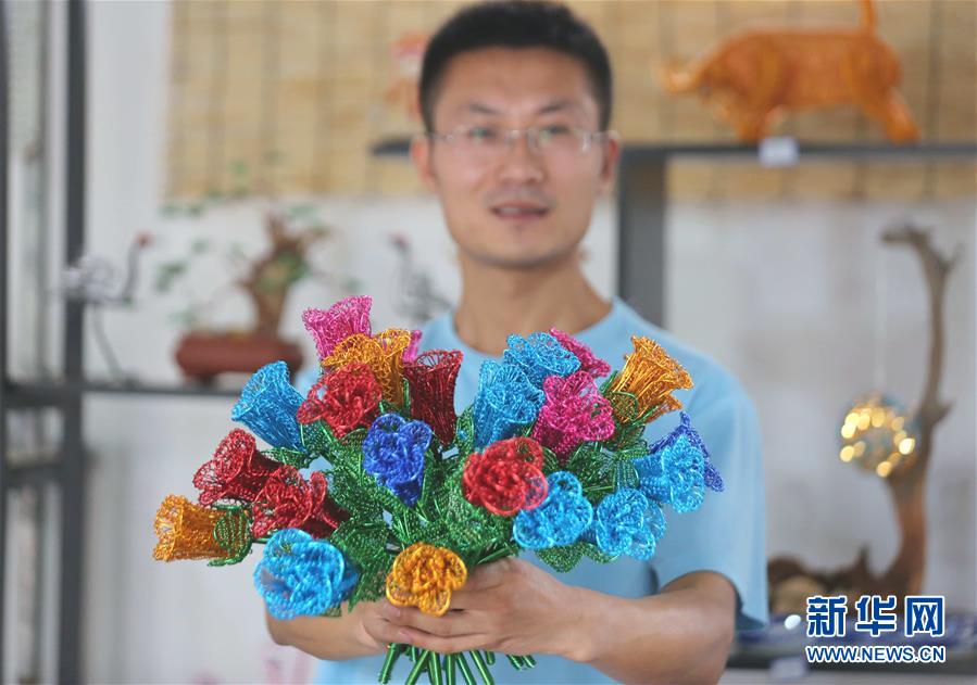 8月30日,蔡兆旺展示用铝丝编织的“玫瑰花”。 新华社发(王彦冰 摄)
