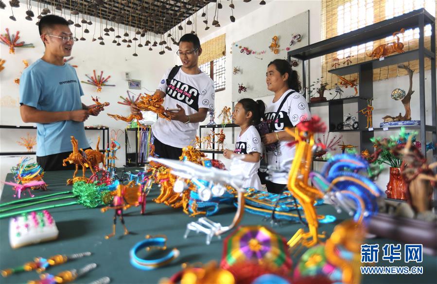 8月30日,蔡兆旺(左一)在工作室向客人介绍他制作的铝艺编织工艺品。新华社发(王彦冰 摄)
