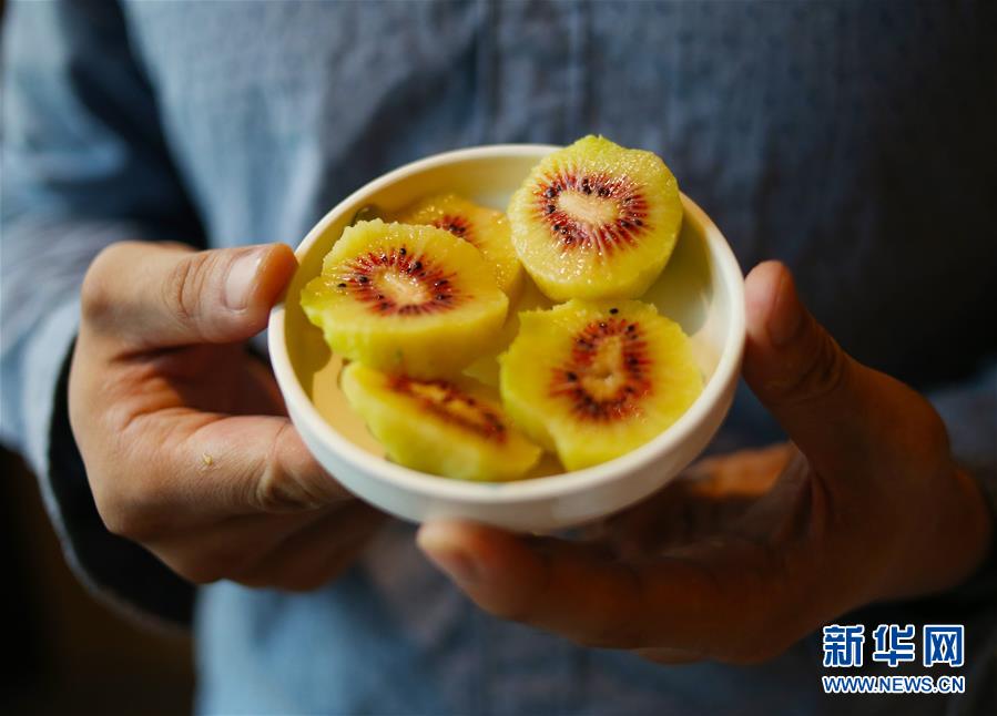 8月30日,一名游客准备品尝从庐山市葳葳种植专业合作社基地采摘的红心猕猴桃。 新华社记者尹炣摄