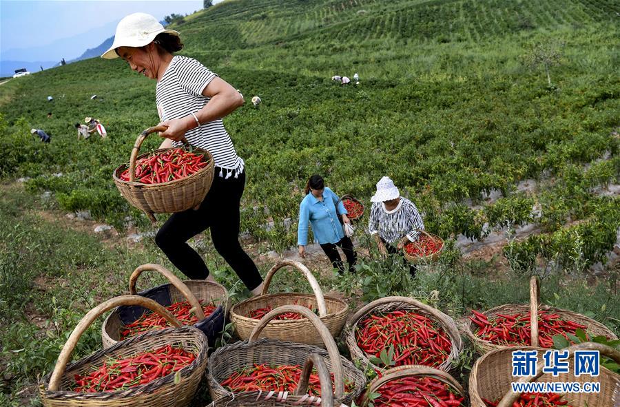 8月30日,陕西省洛南县古城镇周岭村村民在采摘朝天椒。 地处秦岭南麓的陕西省洛南县是国家级贫困县。2018年起,当地依托秦岭腹地海拔高、光照足、早晚温差大的地理区位优势,将辣椒产业纳入全县脱贫攻坚主导产业。目前,全县辣椒种植面积3.5万余亩,带动6000余户贫困户参与发展辣椒产业。 新华社记者陶明摄