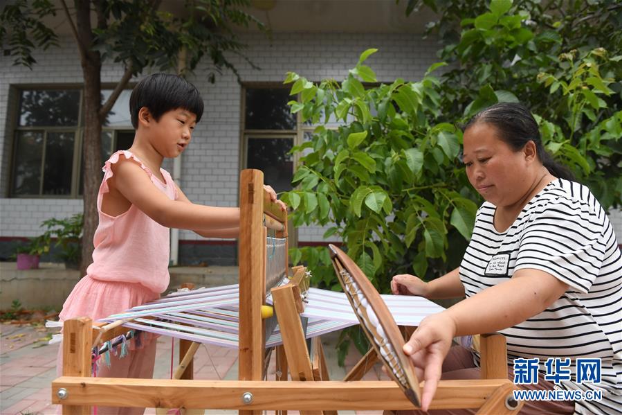 8月30日,河北省巨鹿县西郭城镇柳洼村贫困户王晓云(右)在家中生产手织布。 近年来,河北省巨鹿县在推进精准扶贫过程中,以当地企业大麓古纺布艺公司为龙头,采取“公司+合作社+农户”的形式扶持农村妇女进行手织布生产,企业提供培训、生产材料、加工、销售等一条龙服务,帮助近千名农村妇女在家门口实现就业,开辟出一条脱贫创收新路径。 新华社记者 牟宇 摄