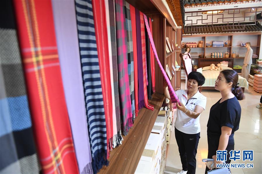 8月30日,在位于河北巨鹿县城的销售门店,大麓古纺布艺公司工作人员向客户介绍产品。 近年来,河北省巨鹿县在推进精准扶贫过程中,以当地企业大麓古纺布艺公司为龙头,采取“公司+合作社+农户”的形式扶持农村妇女进行手织布生产,企业提供培训、生产材料、加工、销售等一条龙服务,帮助近千名农村妇女在家门口实现就业,开辟出一条脱贫创收新路径。 新华社记者 牟宇 摄