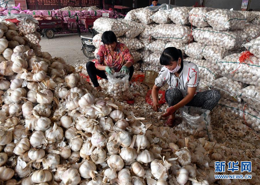 8月30日,蒜商们在河南杞县金杞大蒜国际交易市场内分拣大蒜。 新华社记者李嘉南摄