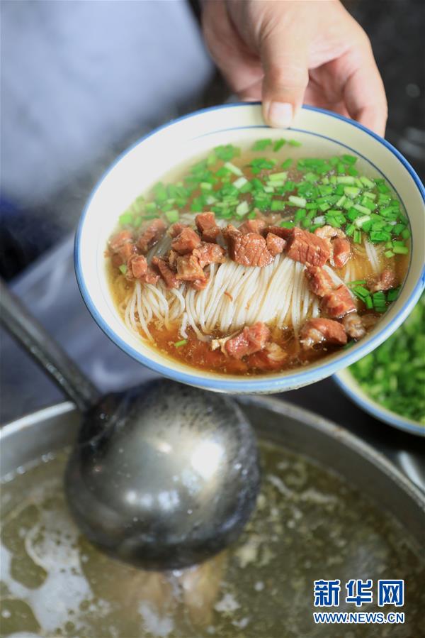 8月30日,在石家庄市鹿泉区德明古镇,无极饸饹非遗传承人袁建鸿展示饸饹面。