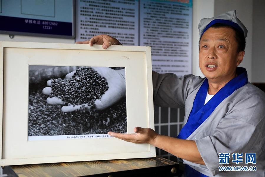 8月30日,在石家庄市鹿泉区德明古镇,无极饸饹非遗传承人袁建鸿介绍饸饹面主要原料荞麦。 新华社发(梁子栋 摄)