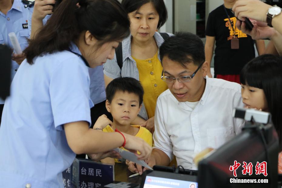 9月1日,台胞王智麟一家四口早早来到安徽省合肥市公安局包河分局户政大厅,申领安徽省第一张港澳台居民居住证。图为户籍民警向王智麟一家四口介绍办证流程。中新社记者 赵强 摄