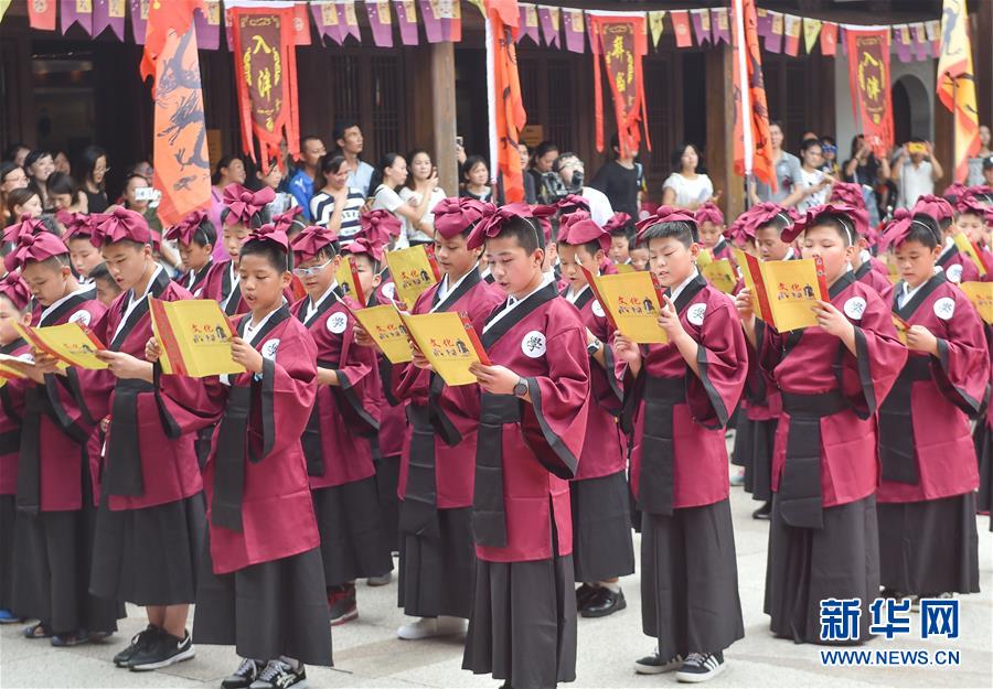 9月1日,福建省福州市马尾区200余名学生身着汉服,在该市廉政文化示范点——船政衙门举行的“入泮拜师礼”上诵读《弟子规》。 当日,福建省福州市举办形式多样的“开学第一课”,弘扬尊师明礼、爱国向善、崇廉明理的传统美德。 新华社记者 宋为伟 摄
