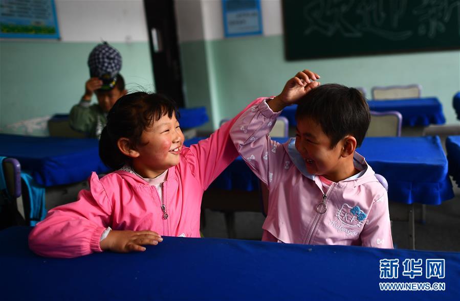 9月1日,马场村教学点新入学的一年级学生李紫颜(左)和童颖一起玩耍。她们在幼儿园就已是朋友。新华社记者张宏祥 摄