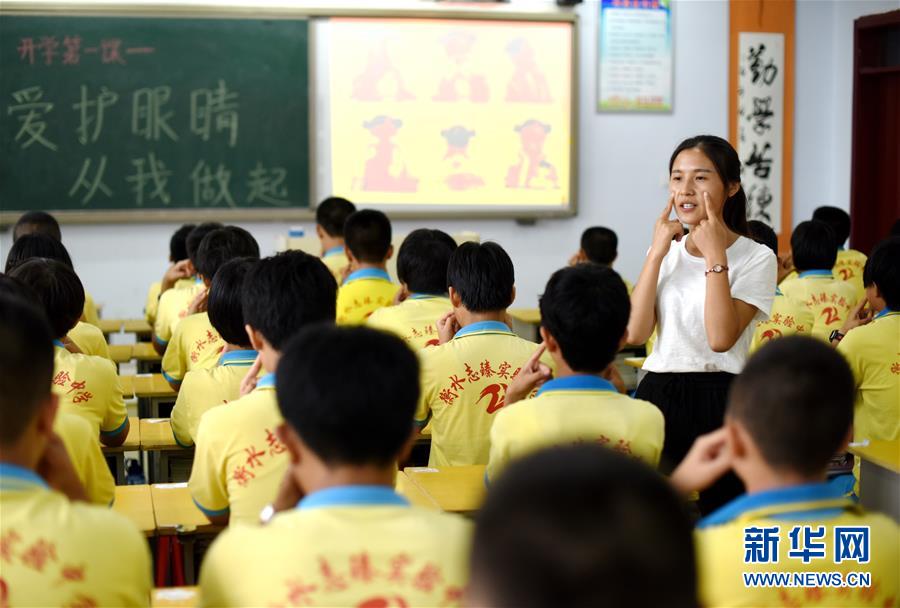 9月1日,衡水志臻实验中学老师指导学生做眼保健操。