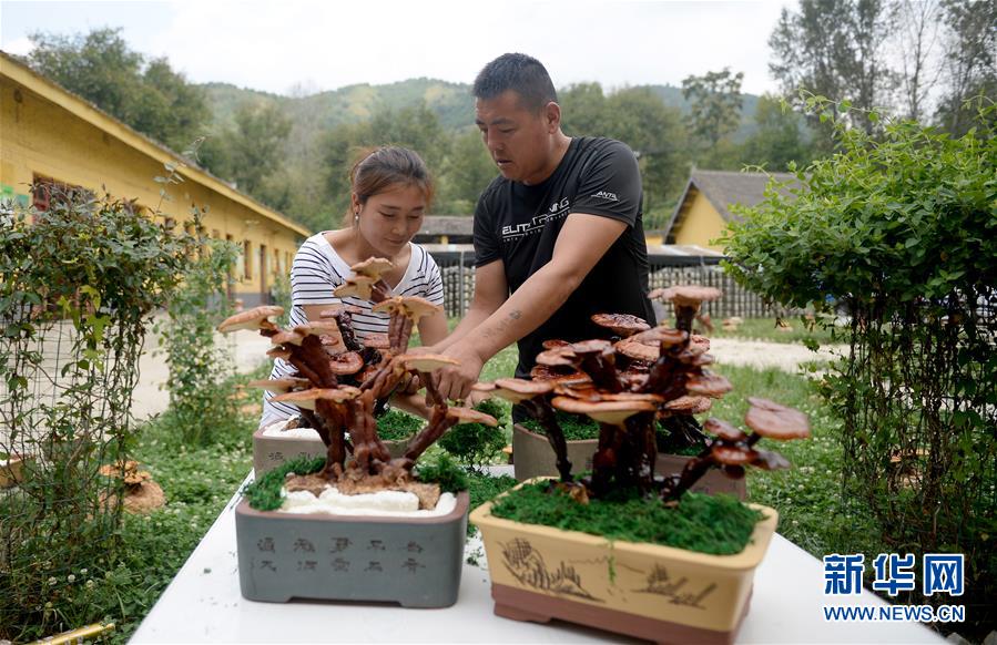 罗婵和丈夫郝延雄在寺耳镇公司的食用菌种植基地制作灵芝盆景(8月31日摄)。 新华社记者刘潇摄