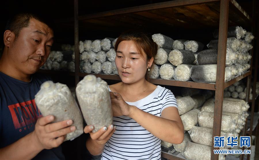 罗婵和作为技术总监的弟弟罗鹏在寺耳镇公司的食用菌种植基地一起查看菌袋(8月31日摄)。 新华社记者刘潇摄
