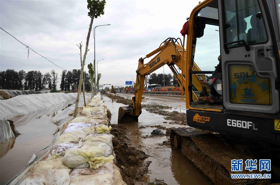 大型机械在寿光市纪台镇东方村附近308国道南侧挖排水渠(8月31日无人机拍摄)。 新华社记者 朱峥 摄