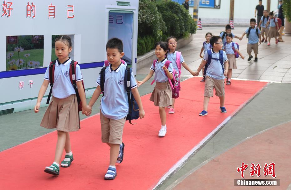 9月3日,7对双胞胎新生牵手走红毯迎开学。当日是山东师范大学附属小学济南校本部开学首日,该校迎来7对双胞胎新生入学。 中新社记者 张勇 摄