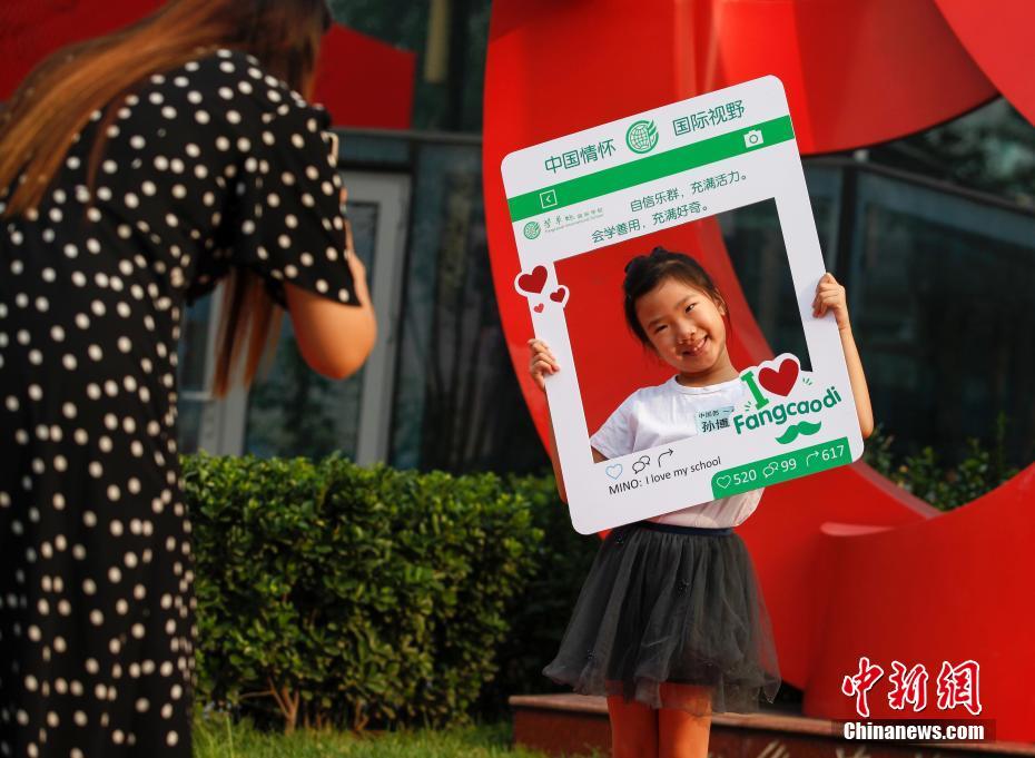 9月1日,北京市朝阳区芳草地国际学校举行开学典礼,老师为一年级小学生拍摄入学纪念照。当日,北京市多所中小学正式开学。 中新社记者 贾天勇 摄