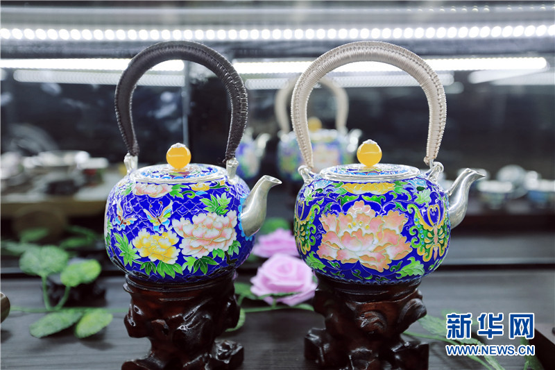 王国春创造性地将苗族银饰和景泰蓝工艺结合在一起,制作的作品很受市场欢迎。新华网 卢志佳 摄