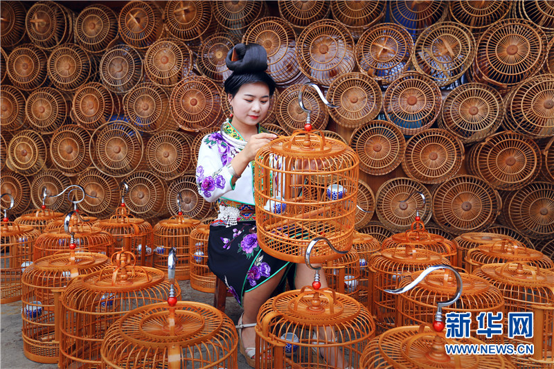 8月28日,丹寨县卡拉村的苗族妇女正在制作“卡拉鸟笼”,当地有120户参与制作鸟笼。新华网 卢志佳 摄