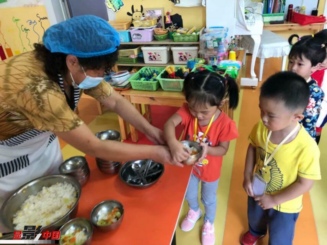 图为甘肃省兰州市城关区保育院小四班的小朋友们正在排队打饭。