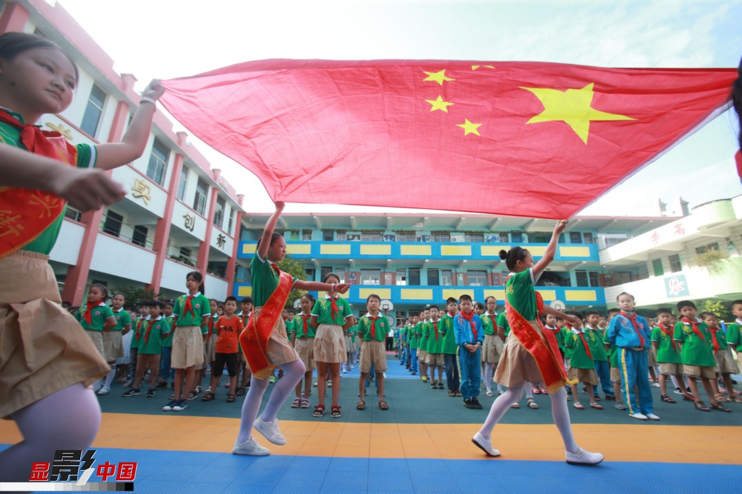 9月3日,开封市复兴街小学校园内师生们在开学典礼上举行升国旗仪式。