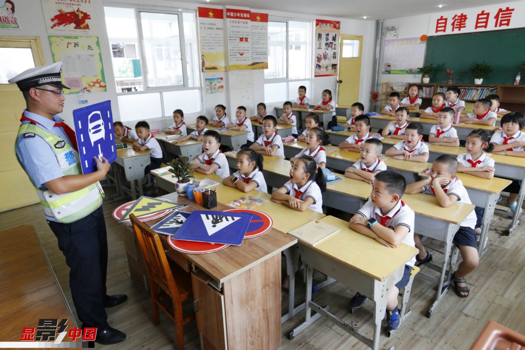2018年9月3日,民警向学生讲解道路交通安全知识。当日是开学第一天,安徽省黄山市交警支队直属一大队民警走进长干路小学,开展“交通安全知识进校园”活动,民警向学生普及道路交通安全常识,增强学生安全出行的意识和能力。新华网发 施亚磊摄
