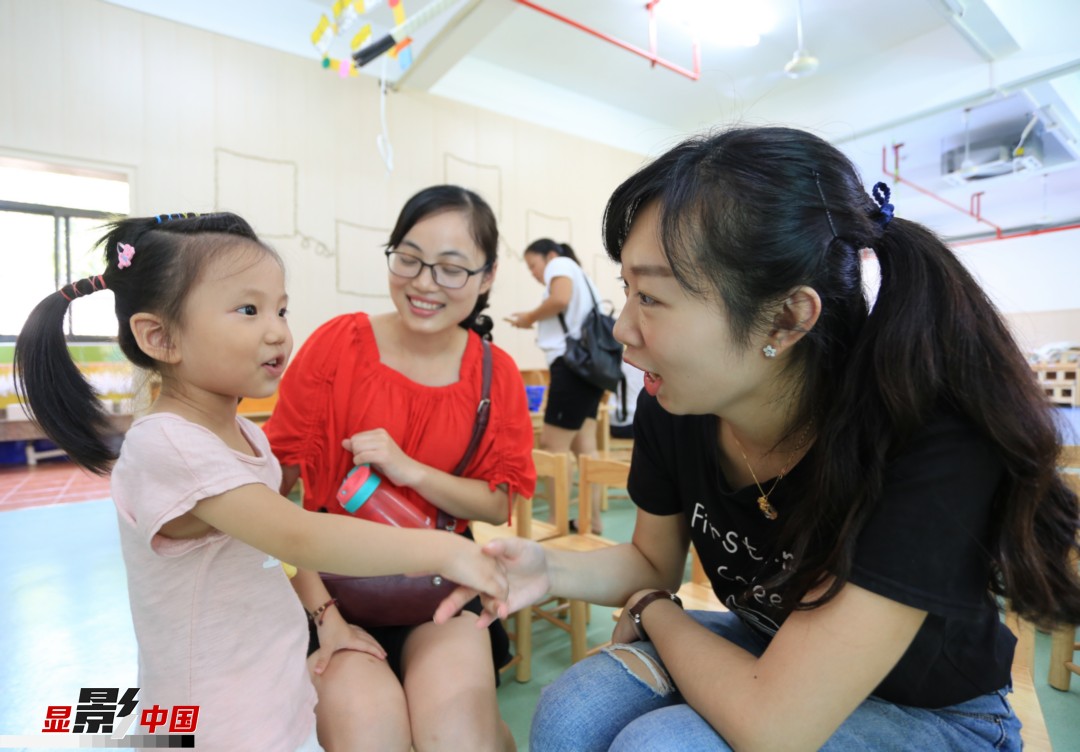 4日清早,福建漳州芗城区东铺头中心幼儿园开园,。短暂的生疏之后 ,一名小女孩拉起老师的手说起悄悄话。新华网 肖和勇 摄