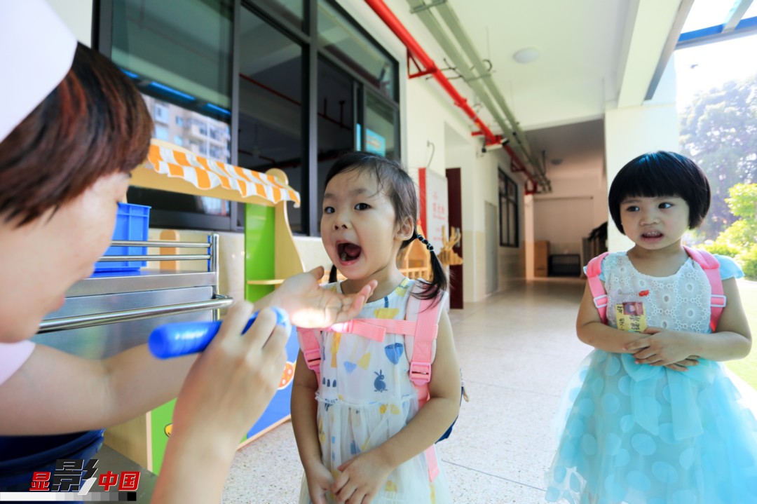 4日清早,福建漳州芗城区东铺头中心幼儿园开园,孩子们接受晨检。新华网 肖和勇 摄