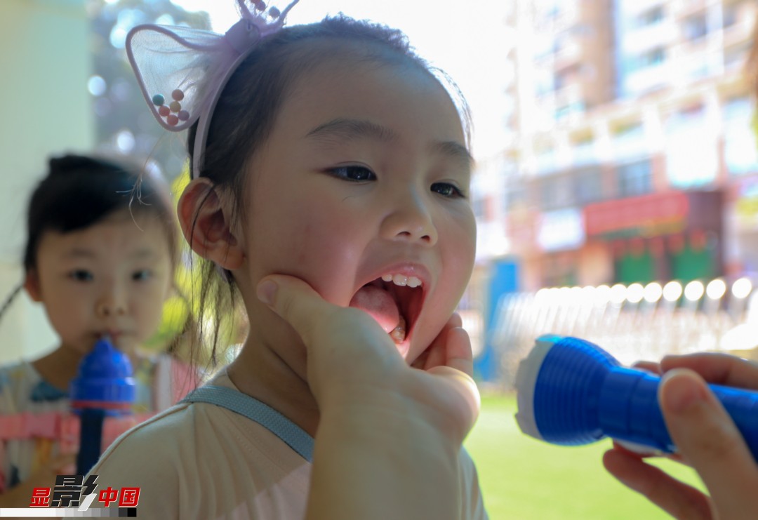 4日清早,福建漳州芗城区东铺头中心幼儿园开园,孩子们接受晨检。新华网 肖和勇 摄
