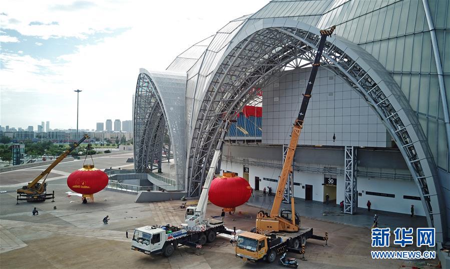 9月4日,工人在贺兰山体育场吊装红灯笼。新华社记者王鹏 摄