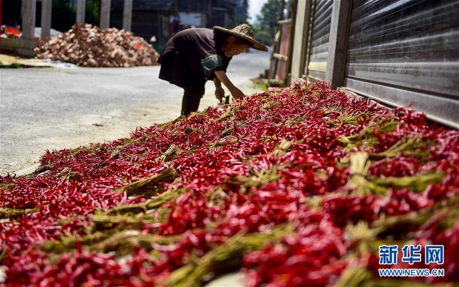 9月4日,在贵州省从江县停洞镇苗朋村,当地妇女晾晒朝天椒。 近年来,贵州省从江县停洞镇在实施产业扶贫过程中,采取“公司+合作社+农户”的经营管理模式,引导农民种植朝天椒,取得良好的经济效益。据介绍,目前该镇朝天椒种植面积达5000多亩,年产值约3000万元。 新华社发(吴德军 摄)