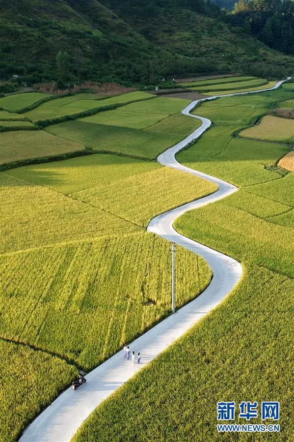 9月3日,在贵州省龙里县湾滩河镇,王丹(右二)去家访时和学生一起回家(无人机拍摄)。新华社发(潘希来 摄)
