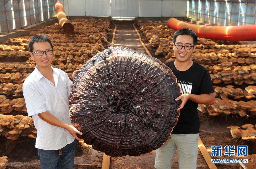 9月4日,韩子南(左)和韩子夜在展示他们培育出的直径达1米的巨型灵芝。 新华社记者牟宇 摄