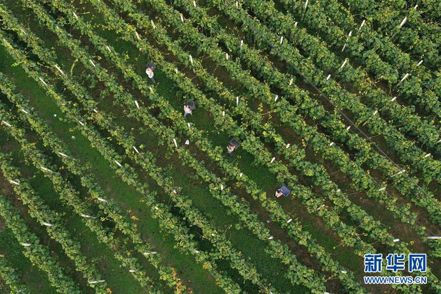 9月4日,果农在贵州省黔西县太来乡一家葡萄种植基地搬运葡萄(无人机拍摄)。 新华社发(杨文斌 摄)